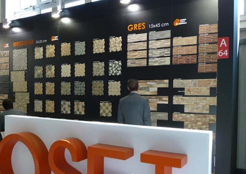 上一屆的博洛尼亞展的產(chǎn)品主要以仿古磚、瓷片為主流,而本屆展會的參展產(chǎn)品有所變化,大量的仿石材、仿天然石的登臺亮相,成為這次展會的主流展品。