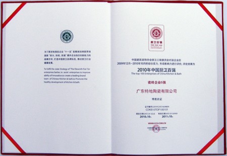 2010年10月9日,由中國建筑裝飾協(xié)會(huì)主辦的2010年度第四屆“中國廚衛(wèi)百強(qiáng)”頒獎(jiǎng)盛典暨亞太空間設(shè)計(jì)師國際論壇在北京國家會(huì)議中心盛大舉行,F(xiàn)場30多家裝飾公司和500多位全國各地的設(shè)計(jì)師及廚衛(wèi)百強(qiáng)企業(yè)代表共襄盛舉,“中國廚衛(wèi)百強(qiáng)”獲獎(jiǎng)名單同步同時(shí)盛大發(fā)布。2010年度"中國廚衛(wèi)百強(qiáng)"評選結(jié)果出爐,特地陶瓷榮獲“瓷磚企業(yè)五強(qiáng)”榮譽(yù)稱號(hào)。