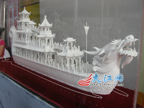 世界上最大的瓷雕龍船。長2.26米,寬0.29米,高0.86米,以精制白泥為主要原料,通過高溫?zé)剖勾w潔白如玉,船體共刻龍圖35處。