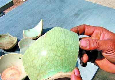 昨日上午,普查小組來到水庫,只見這里依山傍水,盛產(chǎn)高嶺土和釉水等礦產(chǎn)資源,具備燒制青瓷的條件。在水庫原儲水處發(fā)現(xiàn)了大量陶瓷片,堆積層厚達1至5米。普查組專家隨手拿起一件碎瓷,碗底有一個明顯的乳心。專家稱,這是明顯的元代青瓷特色。