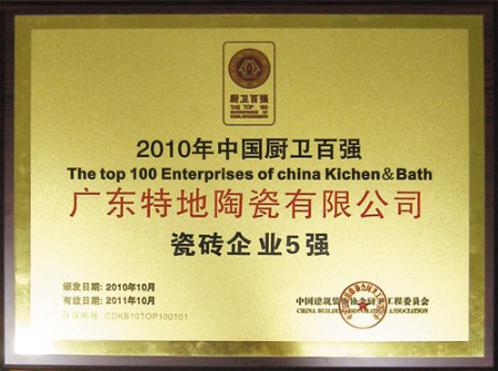 2010年10月,"中國廚衛(wèi)百強(qiáng)"評選結(jié)果出爐,特地陶瓷榮獲“瓷磚企業(yè)五強(qiáng)”榮譽(yù)稱號;同一周,中國陶瓷工業(yè)協(xié)會與陶瓷媒體向特地陶瓷頒發(fā)了“優(yōu)秀企業(yè)文化建設(shè)單位”獎。特地陶瓷近年來在品牌建設(shè)方面成績突出,其中企業(yè)文化建設(shè)的成效更是獲得業(yè)界一致肯定。