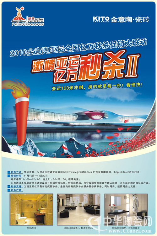 11月10——20日期間,消費者可以通過亞運及金意陶官網(wǎng)登陸“www.kito.cn”對其所喜好產(chǎn)品進行搶購。秒殺成功后,注冊個人資料即可收到秒殺成功短信,憑此信息可于11月21日——28日到金意陶全國各大思想館專賣店進行產(chǎn)品兌換。此外,亞運十一月,凡支持中國健兒的消費者均可得到廣東金意陶廠家的直接優(yōu)惠,亞運會場館選用瓷磚全年最低價銷售,另金意陶堅信本屆中國隊超過上屆中國隊的金牌總數(shù)165枚,凡猜中第二天金牌數(shù)的顧客即可獲精美禮品一份,本屆亞運會上中國獲得的金牌數(shù)量越多折扣也越多,準確猜中金牌總數(shù)更有額外折扣。