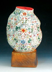 《古瓶新語》是黃煥義“拼貼”技術(shù)的代表作之一。粗獷靈動(dòng)的形體與典雅細(xì)膩的粉彩,形成了強(qiáng)烈的對(duì)比,這種以對(duì)比式的表現(xiàn)手法,在襯托出這個(gè)粉彩瓷瓶的同時(shí),似乎也在述說著這座千年瓷都的演變歷史,播放著古人智慧的結(jié)晶。這不僅巧妙地突出了作品的主題,而且還利用自然來打開欣賞者的思緒,回望歷史,感受陶藝,領(lǐng)略客觀事物與主觀意識(shí)相互統(tǒng)一的和諧。黃煥義這種“拼貼”的造型表現(xiàn)手法,如流星劃破了傳統(tǒng)制瓷的寧靜完美,留下了自我價(jià)值實(shí)現(xiàn)的痕跡。