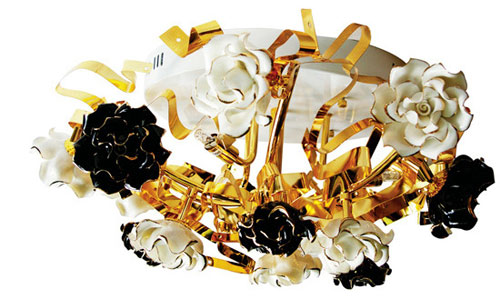手工原色陶瓷材質(zhì)描金邊玫瑰花、24K 鍍金飾邊條,這些工藝讓這盞燈顯得更加璀璨奪目。高亮白烤漆、金屬吸頂盤(pán),采用燈珠作為照明方式,極其美觀。