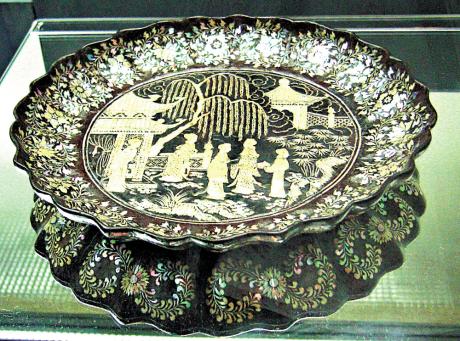 圖:元至明初製「黑漆嵌螺鈿仕女圖九瓣菱口盤」巧奪天工