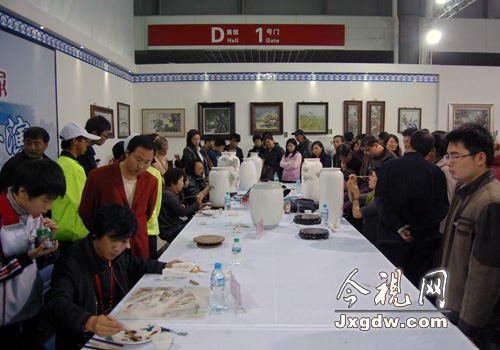 在景德鎮(zhèn)館,游客現(xiàn)場(chǎng)感受陶瓷繪畫藝術(shù)。
