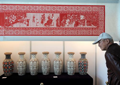 一位市民在參觀剪紙和貝貼花瓶工藝品。