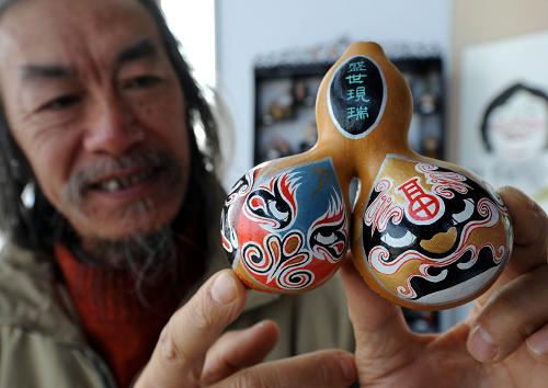 江蘇民間工藝美術(shù)師王東元在展會上展示他用一只連體葫蘆創(chuàng)作的葫蘆工藝品。