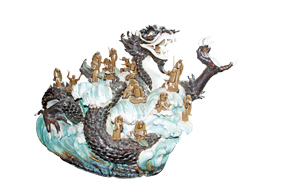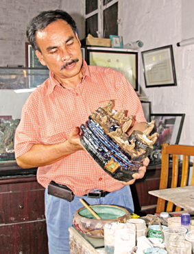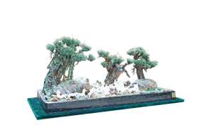 不過(guò),劉國(guó)祥也表示,以前的石灣微塑題材較單一。由于都做成單件的“山公”,或是人物或是亭臺(tái)樓閣,一般都是放在假石山上作為裝飾,也不怎么追求精細(xì),因此這個(gè)行當(dāng)?shù)陌l(fā)展一直比較緩慢。直到他的上一輩才首次以微塑盆景作為表現(xiàn)形式出現(xiàn),方才大大拓展了石灣微塑的題材領(lǐng)域。微塑盆景可以將祖國(guó)的大好河山濃縮到一個(gè)盆景中進(jìn)行表現(xiàn),而且做工更加精細(xì)。