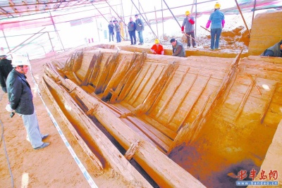 “發(fā)現(xiàn)古船,最該感謝的就是老天爺。”一位考古隊(duì)員說,今年9月16日,一場暴雨襲擊菏澤,讓這個(gè)缺水城市成了“澤國”。由于位于菏澤市和平路與中華路交會(huì)處附近的國貿(mào)中心建筑工地地勢很低,蓄水很多,施工方調(diào)來了抽水機(jī)24小時(shí)抽水。第二天是個(gè)艷陽天,抽完水后工地地槽的積水逐漸退去,工地上的工人在此發(fā)現(xiàn)了一塊木板。起初,工人認(rèn)為這是一塊普通的棺材板,可看了之后又覺得有些不像,兩個(gè)工人便拿起鐵鍬就挖了起來。在沙土堆里,他們發(fā)現(xiàn)了陶瓶陶罐。“如果第二天不是個(gè)艷陽天,積水退得快,古船是不可能被發(fā)現(xiàn)的,這里畢竟比地面低了4米多。”