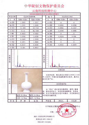 中心呂志堅主任補充說,定窯是我國北方最著名的白瓷窯之一,在中國陶瓷史上占有重要地位,它始創(chuàng)于唐而終于元,燒造歷史達六、七百年之久。定窯白瓷制作精工,造型優(yōu)美,胎色潔白細膩,瓷化程度很高。市售很多定窯白瓷仿制品為達到古籍中描述的“胎薄透影”,在瓷土中摻入大量鋯元素來使胎質堅硬。張先生的鵝頸瓶胎質細膩堅硬,EDX3600L― X熒光光譜儀的檢測數據顯示,瓷胎中鋁元素的含量在20%以上,鋯元素含量為零,說明胎的瓷化程度很高,是傳世定窯白瓷中的精品。