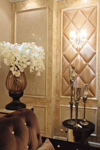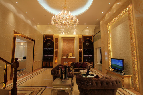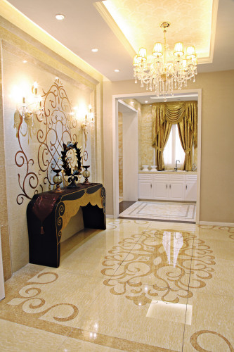 裝修上我們用的是也是高標(biāo)準(zhǔn),用磚上我們用到了很多深加工的工藝,像大廳地面大型的拼花;墻面上的倒角、雕刻裝飾;門套上的立體鋪貼;鎦空的背景墻等都是很精致的。另外我們也用到了很多瓷磚和其它材質(zhì)配合的嘗試,比如茶鏡、金屬、木線、壁紙、皮毛的搭配裝飾,在細(xì)節(jié)上做得既金碧輝煌的華麗而不會(huì)空洞俗氣。你可以看到我們用的家具、燈飾也是配合得很好的,整體就是一個(gè)現(xiàn)代歐式的別墅。