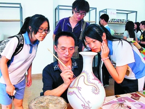 自2008年底深圳被冠以“設(shè)計(jì)之都”稱號(hào)之后,新增的創(chuàng)意產(chǎn)業(yè)園就有深圳設(shè)計(jì)產(chǎn)業(yè)園、深圳動(dòng)漫園、梅沙原創(chuàng)音樂前沿基地、中國(guó)絲綢文化產(chǎn)業(yè)園、深圳陶瓷文化產(chǎn)業(yè)園等。 圖為香港和龍崗兩地大學(xué)生近期在深圳陶瓷文化產(chǎn)業(yè)園內(nèi)參觀陶瓷制作工藝!