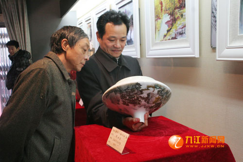 為加強兩地文化交流,12月9日,由中國工藝美術(shù)大師賴德全等領銜的景德鎮(zhèn)市陶瓷研究所工藝美術(shù)大師陶瓷作品展在九江民俗博物館隆重開幕。陶瓷名家現(xiàn)場表演釉上彩和“潑墨”技藝,一幅幅山泉淙淙、峰巒疊嶂的精美畫卷在觀眾嘖嘖稱奇中躍然于陶瓷上。
