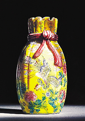 曹興誠(chéng)收藏的“清乾隆料胎畫(huà)琺瑯彩黃地浮云飛鳳牡丹紋包包袱瓶”。
