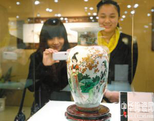 觀眾正在欣賞當(dāng)代“古彩大王”、中國工藝美術(shù)大師戴榮華的《人面桃花相映紅》古彩瓷瓶!