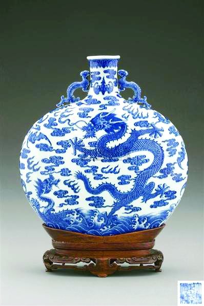 清乾隆青花蒼龍教子雙螭耳扁壺