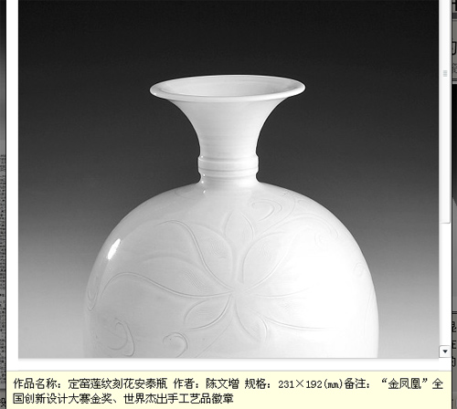 代表作品有定窯“四海呈祥”云龍雕花瓶、定窯三聯(lián)藝術(shù)貴妃瓶、定窯“清風(fēng)峻節(jié)”刻花瓶、定窯蓮紋刻花安泰瓶、定窯梅花口刻花瓶、定窯“六合同春”雕花瓶等,曾獲中國工藝美術(shù)“百花獎(jiǎng)”金獎(jiǎng)、中國工藝美術(shù)創(chuàng)新設(shè)計(jì)大賽金獎(jiǎng)、國家知識(shí)產(chǎn)權(quán)局金獎(jiǎng)、世界杰出手工藝品徽章等,被英國珍寶博物館、國家博物館、中國美術(shù)館、人民大會(huì)堂、中南海紫光閣、國家文物局、國家知識(shí)產(chǎn)權(quán)局、中國工藝美術(shù)館等權(quán)威機(jī)構(gòu)收藏。著作《定窯研究》(45萬字)于2003年出版,填補(bǔ)了定窯無理論的歷史空白。中國古陶瓷研究會(huì)會(huì)長(zhǎng)、廈門大學(xué)教授葉文程在序言中說:“陳文增《定窯研究》一書的發(fā)行,確如千年時(shí)空中一聲晴天霹靂,送來了定窯研究與發(fā)展的新的生機(jī)。”2008年,陳文增的第二本著作《定窯陶瓷文化及其造型裝飾藝術(shù)研究》由河北大學(xué)出版社出版。清華大學(xué)教授、博士生導(dǎo)師楊永善評(píng)價(jià)說:“《定窯陶瓷文化及其造型裝飾藝術(shù)研究》側(cè)重在作為非物質(zhì)文化遺產(chǎn)的定窯文化、藝術(shù)和技術(shù)的研究,作者中國工藝美術(shù)大師陳文增,長(zhǎng)期從事定窯瓷器創(chuàng)作設(shè)計(jì),在定窯研究方面已取得顯著成績(jī),是一位學(xué)者型的工藝美術(shù)家。他的研究特點(diǎn)是緊密結(jié)合工藝實(shí)踐,對(duì)于定窯的造型和裝飾藝術(shù)有比較全面的、深入的分析研究,在工藝程序、方法以及技藝方面的研究也有獨(dú)到之處,為從事陶瓷創(chuàng)作設(shè)計(jì)和工藝實(shí)踐提供了寶貴的經(jīng)驗(yàn)和規(guī)律的總結(jié),應(yīng)該說其理論總結(jié)具有指導(dǎo)實(shí)踐的價(jià)值。”