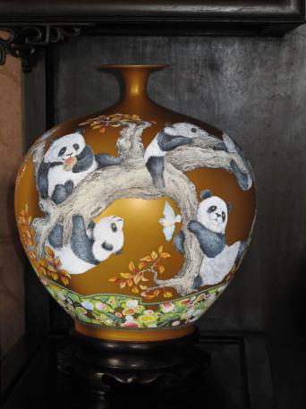 同年,大口鼓腹球瓶《豪家麗景》和觀音瓶《牡丹孔雀圖》被分別以賈慶林和時任國家副主席曾慶紅的名義贈送到訪的臺灣國民黨榮譽主席連戰(zhàn)和親民黨主席宋楚瑜。其中,《豪家麗景》畫面選自清代畫家楊晉的同名作品,描繪清初貴族豪門及其仕女們閒情逸致的奢侈生活!犊兹改档D》畫面取自明朝院體畫派著名畫家呂紀的同名作品。珍禽、名花相配,光彩耀眼,熠熠生輝。