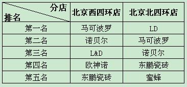 北京紅星美凱龍其他店面瓷磚品類銷量排名: