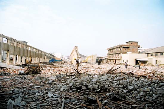 2008年,南莊鎮(zhèn)一家遷走的陶瓷企業(yè),工人正在清理拆遷現(xiàn)場,騰出來的土地將作為陶瓷商貿(mào)業(yè)的發(fā)展的用地。 張磊 攝