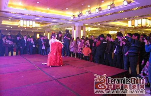 跨進(jìn)宴會(huì)廳的大門,金絲玉瑪陶瓷獨(dú)具特色的藝術(shù)產(chǎn)品在華燈的照射下顯得更加璀璨奪目、光艷亮麗,設(shè)計(jì)師們?cè)趷偠p快的爵士音樂伴奏下輕松愜意地享受著這出精彩的產(chǎn)品盛宴。筆者在參觀產(chǎn)品的過程中采訪了幾名設(shè)計(jì)師,其中有一名設(shè)計(jì)師指著K金玉石系列產(chǎn)品講道:“像金絲玉瑪這樣花色豐富、紋路清晰可見、晶瑩剔透的產(chǎn)品是我前所未見的,用在酒店等高檔場(chǎng)所簡(jiǎn)直比真石材更優(yōu)百倍”,緊跟其后的另一名設(shè)計(jì)師接過話頭說:“金絲玉瑪產(chǎn)品配套極為豐富,這是我們泰州市場(chǎng)上沒有任何一家同類產(chǎn)品能做到的,以后用這些豐富的產(chǎn)品作為設(shè)計(jì)元素肯定能為我們的創(chuàng)作注入新的靈感”,其他設(shè)計(jì)師也紛紛在抽獎(jiǎng)劵上寫下自己最喜愛的金絲玉瑪產(chǎn)品型號(hào)及理由。晚宴中,中國傳統(tǒng)的變臉?biāo)囆g(shù)、神奇的魔術(shù)表演、現(xiàn)代味十足的人體彩繪等節(jié)目為現(xiàn)場(chǎng)嘉賓帶來了與眾不同的視覺享受,給參會(huì)的嘉賓們留下了一個(gè)難忘的夜晚。