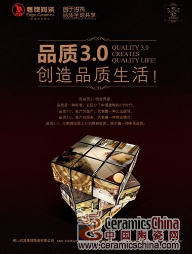 在3•15國際消費者權(quán)益日來臨之際,鷹牌陶瓷首度發(fā)表“品質(zhì)3.0”白皮書,提出以“品牌、產(chǎn)品、服務”為一體的整體品質(zhì)提升發(fā)展戰(zhàn)略。這戰(zhàn)略承襲了鷹牌陶瓷一直以來品質(zhì)核心的品牌理念,站在行業(yè)和市場的高度將品質(zhì)定義為一種標準,區(qū)分了中國建陶發(fā)展的三個時代。