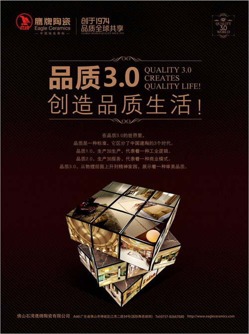 正是鷹牌陶瓷擁有如此卓越的品牌品質、產品品質和服務品質,品質3.0應運而生,為中國陶瓷行業(yè)帶來全新的品質思想,以大浪潮的姿態(tài)引領陶瓷行業(yè)品質全面升級。但是品質3.0絕不是鷹牌陶瓷品質發(fā)展的終點,率先進入品質3.0時代的鷹牌陶瓷,勢必以更嚴格的要求來加強自身品質建設,時刻謹記創(chuàng)新與承諾,以行業(yè)領跑者的姿態(tài)站在行業(yè)發(fā)展的最前端,大膽接受市場的考驗,從企業(yè)的各個細節(jié)方面做到盡善盡美,成為具有高含金量的品牌,高技術含量的產品,高附加值的服務的品質企業(yè),去迎接品質發(fā)展的另一座高峰,為消費者構建高貴品位的品質生活,推動中國家居文化和價值觀的品質演進。