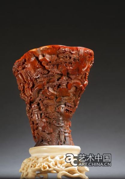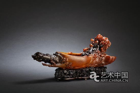 翻閱古今文獻(xiàn)著錄可知,盡管犀角制品的使用歷史悠久,但隨著犀角資源的稀缺,其使用權(quán)一直被皇戚貴族控制著,早在商周、漢朝時(shí)期,犀角已是進(jìn)貢皇帝的寶物,明朝時(shí)更是將其列為珍寶類藝術(shù)品,甚至被統(tǒng)治者用作等級(jí)制度的象征。近些年隨著犀牛被列為世界珍稀保護(hù)野生動(dòng)物,犀角制品日益稀缺,加之收藏作為人們的一種高雅的消遣和投資理財(cái)活動(dòng)已日趨普遍,業(yè)余收藏愛好者數(shù)量不斷擴(kuò)大,其收藏的品種和門類也在不斷增多,包括角雕在內(nèi)的一些過去十分難得一見的高貴工藝美術(shù)品,現(xiàn)在終于有人敢于問津,故而愈顯犀角雕刻藝術(shù)的瑰麗之妍。本展覽中最引人關(guān)注的便是那些題材較為罕見的作品,如明代犀角雕百子圖杯便是一例。此器體量頗巨,精工細(xì)雕,敞口斂足,自然的弧度盡展犀角之原美,通體采用深淺浮雕、鏤雕技法雕刻出“百子嬉戲圖”,眾小兒在山林幽壑間嬉鬧追逐,其憨狀可掬,神情栩栩如生,此題材寄寓了人們對百子千孫的愿望,更體現(xiàn)了儒家詩禮傳家的傳統(tǒng)思想。而另一件犀角雕鮑天成作張騫泛槎器不僅雕工精美,亦有名家款識(shí),保存至今仍品相完好,于北京故宮博物院及臺(tái)北故宮博物院均有同類器物收藏可作參照。除此之外,還有尤侃制犀角雙鷹杯、犀角雕梅花癭木題詩大杯、山水樓閣人物犀角杯、海水八怪犀角杯等等,營造出自然珍禽、詩書畫意、童稚雅趣等不同意境,令人不由稱奇。