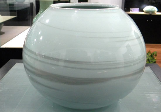 從此次參展的作品來看,參展作品《天池》采用雙層拉坯法,倒置拉坯成型,器型飽滿厚重,內(nèi)青外白,特殊刀法刻畫出的流動性線條使作品產(chǎn)生旋轉(zhuǎn)中的率動性,一弘清泉,浩月在天,動與靜的巧妙結(jié)合,使作品具有強烈的視覺效果和藝術(shù)感染力!对扑泛喚氾枬M,流動性的絞胎紋線條粗細相間,宛如行云流水,構(gòu)成了一幅江南山水畫,作品詩一般的意境和獨特的田園風(fēng)情,讓人產(chǎn)生無限遐想。美輪美奐,比較全面的展示了盧大師近年青瓷藝術(shù)的巨大成就。