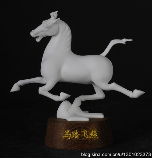 但凡了解瓷塑的人都知道,由于瓷器要經(jīng)過一千多度高溫的燒煉,最高溫時(shí)的瓷胎會(huì)呈現(xiàn)一種熔融狀態(tài),如果胎體重心不穩(wěn),燒煉中極容易變形甚至癱倒成為廢品,因此瓷塑的底部從工藝角度講,應(yīng)該越敦實(shí)越好。尤其對(duì)馬的四條細(xì)長(zhǎng)腿,瓷塑家都會(huì)盡量避免如實(shí)塑造。難能可貴的是,林建全總是做別人難以做到的事,想別人沒想到的招。他創(chuàng)作的瓷馬幾乎每匹都四蹄飛揚(yáng)----四只翻飛的馬蹄都交代得清清楚楚,站立得穩(wěn)穩(wěn)當(dāng)當(dāng)!如圖“馬踏飛燕”(見圖),原文物是一件青銅器,青銅質(zhì)材單腿曲立當(dāng)然就沒有工藝難度,何況不經(jīng)火燒。而這件瓷塑“馬踏飛燕”,造型精準(zhǔn)不說,居然靠著一條細(xì)而彎曲的腿撐住了馬的碩大身體,并經(jīng)過千度以上高溫火的洗禮而毫無失重感,簡(jiǎn)直讓人不可思議!