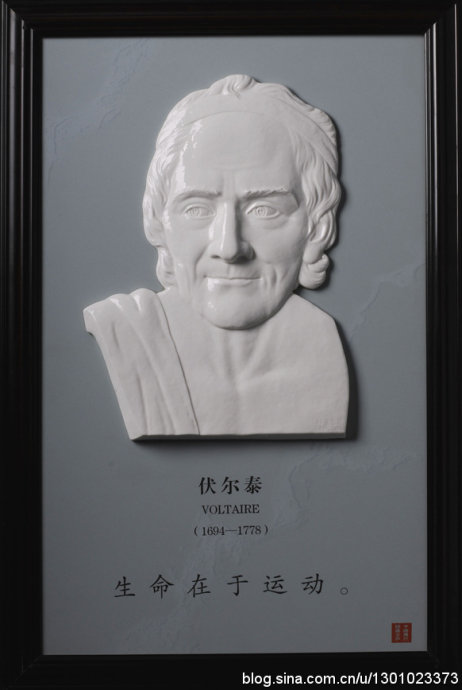 德化瓷塑,自何朝宗始,作品造型形態(tài)優(yōu)美、衣褶組合富有韻律和節(jié)奏,仿佛行云流水,動(dòng)靜得宜。充分體現(xiàn)了中國(guó)傳統(tǒng)雕塑的美感,同時(shí)又以著意塑造人物的精神內(nèi)涵為能。林建全不僅很好地繼承了何朝宗瓷塑的優(yōu)秀傳統(tǒng),并且注重將傳統(tǒng)技法與現(xiàn)代理念相融會(huì),塑造出不少具有現(xiàn)代人文價(jià)值和審美情趣的作品,從而實(shí)現(xiàn)了對(duì)德化傳統(tǒng)瓷塑的豐富和突破。他創(chuàng)作的《世界名人肖像浮雕》《十大元帥浮雕》《偉人毛澤東塑像》等系列作品,不僅形準(zhǔn)(都做得很像),并且讓人能感覺出不同名人的不同精神“氣場(chǎng)”:睿智幽默的愛因斯坦、犀利深刻的托爾斯泰、不屈不撓的貝多芬、淡定自信的居里夫人......既見“真象”,又顯真魂,俱各恰到好處。而我最欣賞的作品是浮雕《伏爾泰》。