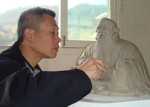 林建全的藝術(shù)造詣當(dāng)然不能跟那些風(fēng)流絕代的宗師們相提并論,但是他對(duì)瓷塑藝術(shù)的癡狂勁,卻跟他們?nèi)绯鲆晦H。見到其人,你能強(qiáng)烈感受到他的這種真情。說他癡,一談起瓷塑他就興奮得像個(gè)孩子,說自己每投入創(chuàng)作,一做就是十幾個(gè)小時(shí),精神總是處在“瘋狂狀態(tài)”中;說他狂,他知人論世,不僅眼光獨(dú)到,敏思有識(shí),而且快人快語,干脆利落。他的“癡”和“狂”,說到底還是源于性情的“真”,源于他對(duì)瓷塑藝術(shù)真摯的深情。他于1960年生在德化,從小耳濡目染于瑩潔溫潤(rùn)的德化白瓷世界,浸潤(rùn)于何朝宗等著名匠師的瓷塑技藝之中,與德化瓷塑藝術(shù)天生有著不解之緣。他說自己幾十載創(chuàng)作瓷塑,苦心孤詣,甘于寂寞,每件作品從構(gòu)思、起稿、完善到最后完成,經(jīng)歷這樣的過程本身就是一種享受,比干什么都好。