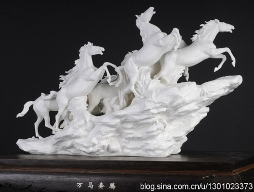 仍然以馬為例,馬的真魂是什么?在林建全的瓷馬上我看到,馬的速度和雄性本質(zhì),即是馬的真魂。藝術(shù)家無論畫馬還是塑馬,作品中看不到馬的速度或動(dòng)感,那是一匹缺乏生命力的病馬。而一匹烈馬,即使被拴住,它的四蹄、鬃毛、眼神、耳朵乃至鼻息,傳遞的信息都應(yīng)該是不安分的。再者,馬雖然也分雌雄,但它的“雄性本質(zhì)”是其真魂,即是曹孟德說的四字:“志在千里”。否則你無法理解古今人為什么都那么喜歡馬?它寄寓的是人類對(duì)未來生活的深切向往和希望。林建全創(chuàng)作的近百件瓷馬,突出的共同點(diǎn)就是十分精準(zhǔn)地塑造出了馬的真魂,我甚至有理由認(rèn)為,他本人其實(shí)就是一位具有馬的性格、具有“馬的速度和雄性本質(zhì)”的瓷塑藝術(shù)家。