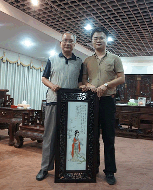 中國(guó)工藝美術(shù)大師王隆夫、藏樂閣總經(jīng)理彭鵬和其作品合影