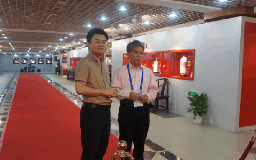 藏樂閣總經(jīng)理彭鵬(左)同廣東省工藝美術(shù)大師聯(lián)誼會(huì)會(huì)長(zhǎng)張春雷(右)交流