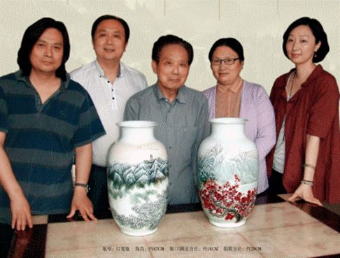 張松茂,為“珠山八友” 劉雨岑傳人,中國工藝美術大師、首屆亞太地區(qū)手工藝大師,1300萬元的粉彩雪景作品《三顧茅廬》,被譽為中國當代藝術陶瓷價格第一人,徐亞鳳為“珠山八友”徐仲南之后,中國工藝美術大師,7501毛瓷的主創(chuàng)者之一、水點桃花與水點梅花的傳承人,2003年,其4件毛瓷水點桃花作品曾被新加坡藏家以不可思議的競賣成交。其子女張曉松、張曉杰、張慧均為江西省工藝美術大師,是景德鎮(zhèn)著名的“雙陶瓷世家”!缎袢諙|升》是他們第一次以家族形式創(chuàng)作的重要作品,其重要性不言而喻。