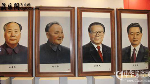 該作品是在以獻(xiàn)禮中國(guó)共產(chǎn)黨成立90周年為創(chuàng)作背景,謳歌黨和國(guó)家的領(lǐng)導(dǎo)人(毛澤東、鄧小平、江澤民、胡錦濤——從左至右依次),感受中國(guó)共產(chǎn)黨走過(guò)90載的光輝歷程,吳錦華大師特以“四代偉人像”展現(xiàn)讓今天幸福生活在紅旗下的中國(guó)人領(lǐng)略四代領(lǐng)導(dǎo)人的風(fēng)采。