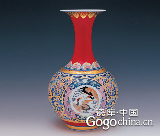 圖:中國紅描金工藝松鶴延年天球賞瓶