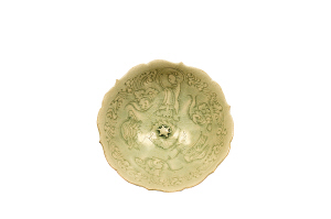 1998年6月,瓊海漁民在西沙華光礁捕魚作業(yè)時,采挖出北宋瓷器和錢幣。其中,最具傳奇色彩的就是做工精美,釉色呈天青色的龜鶴仙人紋碗和盤。碗葵花形口沿,胎體薄而透光,釉水天青色,碗心有一凸起小龜,碗內壁刻劃仙人、仙鶴、龜、祥云?袒ㄐ性屏魉,刀法嫻熟,各個造型惟妙惟肖,出神入化。仙人飄逸灑脫,仙風道骨,欹側揖讓觸處成妙。仙鶴曲頸而棲,恬適靜美。龜則騰云駕霧,遒勁而走。龜盤刻劃內容亦然,不同之處為淺腹,淺圈足。碗和盤底均無釉?坍嬛疄⒚摾寺梢韵胂蠊湃肆巳挥谛,飛刀走石之間,天馬行空,飛逸奇恣,一氣呵成的優(yōu)雅一瞬。