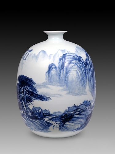從1982年開(kāi)始,為改變傳統(tǒng)繪畫技法,受高溫顏色釉窯變景象萬(wàn)千之啟示,從山水畫著手,開(kāi)擴(kuò)潑墨彩研究,通過(guò)墨彩的自然暈散與流動(dòng)來(lái)表現(xiàn)自然界變化莫測(cè)的物象和意境。按唐人王恰“以其痕跡,為山為石”之說(shuō),結(jié)構(gòu)山石林泉,追求天趣,展現(xiàn)其詩(shī)情畫意。將一些創(chuàng)新的特殊技法移植到陶瓷繪畫中,體現(xiàn)了對(duì)陶瓷美術(shù)創(chuàng)作的新定位及新思考。