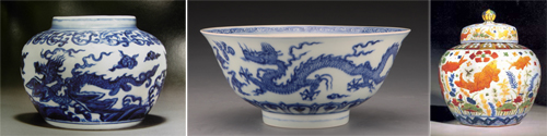 左圖:明成化 青花“水波飛龍”圖罐!≈袌D:明永樂(lè)青花暗刻龍紋碗。 右圖:明嘉靖 五彩魚(yú)藻紋蓋罐。