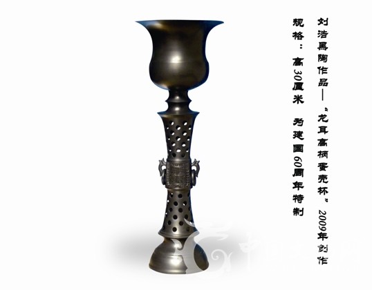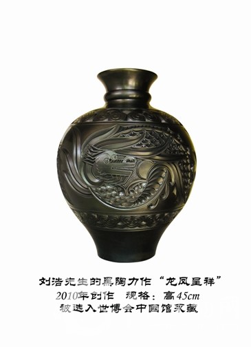 此次,劉浩先生同多名黑陶藝術家組團亮相2011山東陶瓷藝術博覽會,展出的黑陶作品在繼承傳統(tǒng)的基礎上大膽創(chuàng)新,變幻出新的結構形式,廣泛的從不同的方位尋求了新的表現(xiàn)方式,有具象,有抽象,也有三度空間的立體造型。在百余件參展作品中,《龍耳高柄蛋殼杯》、《龍鳳呈祥》等極具代表性的黑陶作品,凝聚著創(chuàng)造者獨特的藝術構思,表現(xiàn)著各自的獨特魅力,襯托著返璞歸真的氣質。在著力弘揚齊魯文化的理念下,本次博覽會展示現(xiàn)代黑陶藝術的高超技藝,給廣大陶瓷愛好者提供了一場視覺盛宴。