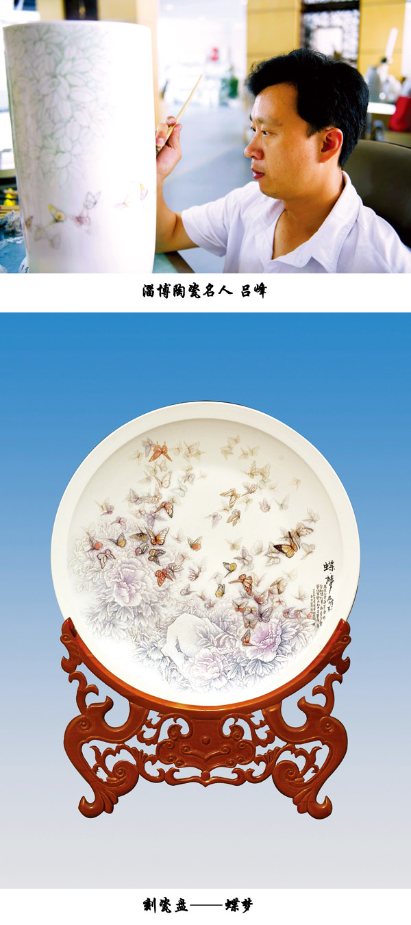 呂峰,1970年生于淄博,擅長陶瓷彩繪及刻瓷藝術。從藝二十幾年來,多次為國內(nèi)外政要、名流刻制肖像。論文及個人作品在國家級美術期刊《美術大鑒》發(fā)表,多幅作品被中國(淄博)陶瓷館、上海藝博會收藏。在全國及省級創(chuàng)作評比中多次獲獎。其作品以細膩見長,追求淡雅氣質與精細刻畫相結合,在刀法運用、用筆著色上不取俗艷以趨時,大膽創(chuàng)新,形成了自己的創(chuàng)作風格。代表作有:"金陵十二釵"系列手彩瓶、20寸"蝶夢"刻瓷盤、"百蝶爭艷"手彩瓶等,深受收藏家們的喜愛。