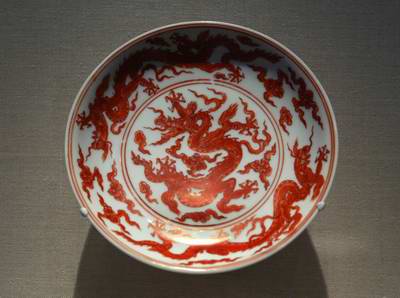 官窯瓷器的紋飾比較工整、細(xì)致,民窯器物的紋飾筆法瀟灑、自由奔放,生動(dòng)地表現(xiàn)了對(duì)現(xiàn)實(shí)美好生活的愿望。畫(huà)面題材很豐富,人物、花鳥(niǎo)、飛禽走獸無(wú)所不有,有些畫(huà)面取材于錦緞上的紋飾,或受小說(shuō)木刻插圖影響,或取材于戲劇、民間故事傳說(shuō)等。有些內(nèi)容尤其是在官窯器物上,反映了當(dāng)時(shí)封建統(tǒng)治者的思想意識(shí),有些則帶有封建迷信色彩。明代所畫(huà)的人物比較挺拔,小孩兒頭比較肥大,不合比例,前額及后腦凸出,明代早期龍鱗畫(huà)得比較精細(xì),晚期有的龍鱗畫(huà)得草率,龍爪畫(huà)得比清代簡(jiǎn)單,但龍爪雄壯有力。畫(huà)龍比較窄瘦、龍咀較長(zhǎng),一般都稱為豬咀龍。此時(shí)八寶紋的排列多為輪、螺、傘、蓋、花、魚(yú)、罐、腸。后仿品有時(shí)忽略此點(diǎn),在鑒定時(shí)應(yīng)注意觀察。明代瓷器上有以文字作為紋飾裝飾內(nèi)容,如梵文、阿拉伯文、壽字、福字等。紋飾多為云龍、云鳳、纏枝花卉,后來(lái)出現(xiàn)人物、飛禽走獸、八仙、人物故事等。官窯瓷器比較工整細(xì)致,民窯比較粗放、生動(dòng)。