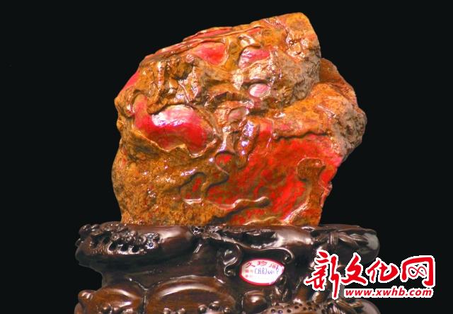 在3號展廳,一塊80厘米左右長,40厘米左右高的昌化田黃雞血石引得眾人關(guān)注。昌化雞血石由于石頭表面有像雞血一樣的顏色而得名。昌化雞血石被命名為“石后”,地位并列于壽山石田黃。