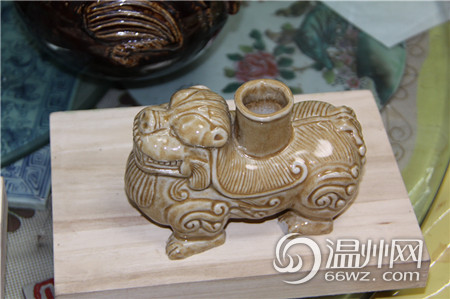 獅子如果發(fā)福了會(huì)是什么樣子?在甌窯陶瓷藝術(shù)研究所里,記者就看到這樣一只“發(fā)福”的獅子,胖嘟嘟的獅軀披著一層淡淡的黃褐色釉彩,配上短而肥的四肢,形象憨厚可愛。特別是那柄留在豐碩屁股上的一小圈尾巴,怎么看都不像是孔武有力的獅尾,更像是一只卡通豬身上打圈圈的尾巴,很難讓人感覺獸王的威嚴(yán)與強(qiáng)悍。然而說(shuō)起這只“發(fā)福”獅子背后的故事,卻不得不讓人大吃一驚。這是一件西晉甌窯青釉獅形燭臺(tái)仿品,其真品現(xiàn)珍藏于溫州博物館,距今已有1700多年歷史,論工藝成熟年限,眼下受人追捧的青花瓷只能算是它的“徒子徒孫”輩。