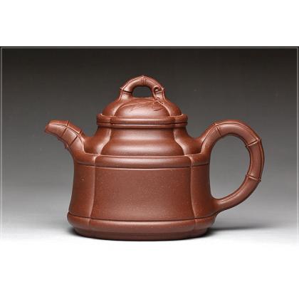 上圖所展示的這款同樣由朱峰創(chuàng)作的紫砂壺整器施藝嚴(yán)謹(jǐn)細(xì)致,注重細(xì)節(jié),壺把壺蓋壺身相輔相成,是難得的竹子造型的壺。據(jù)博寶藝術(shù)網(wǎng)的專家介紹說(shuō),明清的紫砂壺在造型方面有了很大的突破,極大地豐富了我國(guó)的紫砂壺的形式和內(nèi)涵。紫砂壺發(fā)展到今時(shí)今日,呈現(xiàn)出一派繁榮的景象,但是,也面臨著傳統(tǒng)手藝的失傳等問題。收藏紫砂壺?zé)o疑也是對(duì)紫砂壺的拯救做出貢獻(xiàn)。