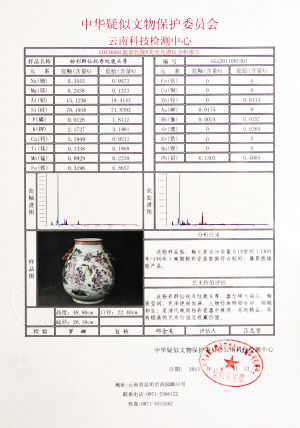 雙鹿首耳更是繪制絕妙,除了形狀寫實(shí)之外,連鹿毫及鹿角的紋路都表現(xiàn)得淋漓盡致。鹿頭突起及邊緣部分因年代久遠(yuǎn),粉彩釉色部分脫落,呂志堅(jiān)說(shuō)這是長(zhǎng)年累月清掃灰塵留下的痕跡,并將其判為清晚期民窯產(chǎn)品。隨后進(jìn)行EDX3600L儀器檢測(cè),得出結(jié)果:“送檢樣品釉、胎化學(xué)元素成分含量與19世紀(jì)晚期(清同治、光緒前后)粉彩瓷器數(shù)據(jù)符合較好,屬景德鎮(zhèn)窯產(chǎn)品”。
