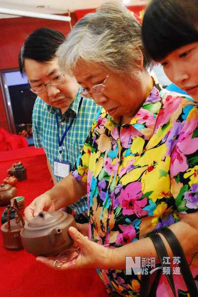 8月20日,中國工藝美術大師汪寅仙在壺友節(jié)上給“壺迷”鑒定紫砂壺。